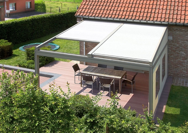 De terrasoverkapping bestaat uit 3 delen (Dak, zijkanten & voorkant). Deze zijn allemaal apart verkrijgbaar en kunnen volledig of gedeeltelijk worden geopend of gesloten.